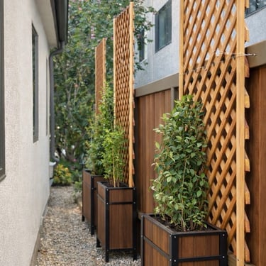 Side yards are often underused due to tight dimensions and lack of design planning. These custom planters solve several problems at once: