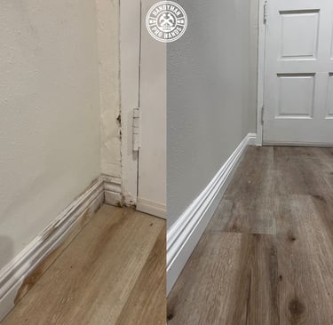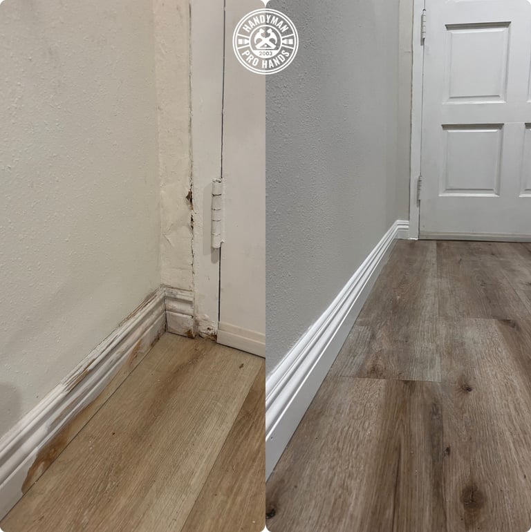 Drywall and Baseboard Repair After Water Intrusion Caused by Incorrect Sprinkler Placement Near the Front Door