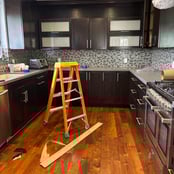 The client contacted us after experiencing a major water leak in the kitchen, possibly from a broken pipe or appliance malfunction. Visible signs included swollen flooring, buckling in certain areas, and a persistent musty odor. We started by removing toe kicks from the kitchen cabinets, uncovering dark discoloration and soft plywood — early signs of water damage and possible microbial growth.