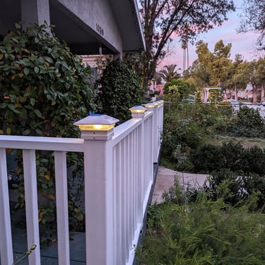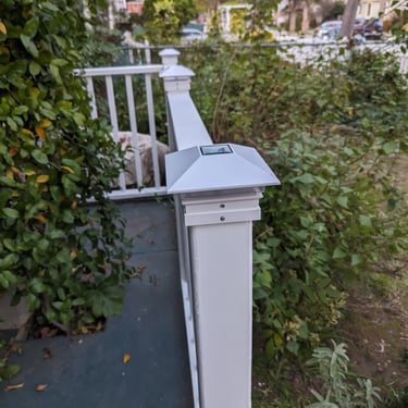 Finally, we added solar post cap lights to each column. These automatically charge during the day and illuminate softly at dusk, creating a warm, welcoming glow around the porch.