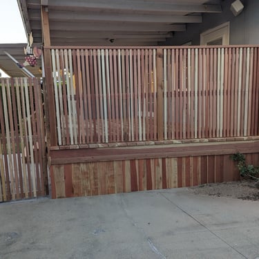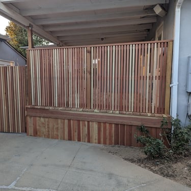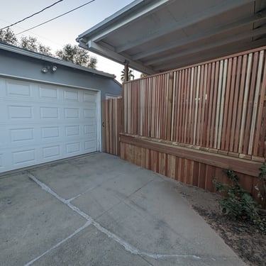 • Gate: Custom-built Redwood gate matching the fence design, with heavy-duty hinges and latch
