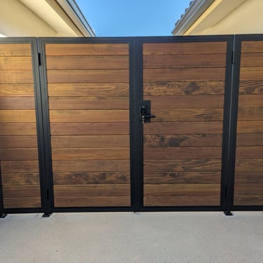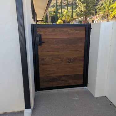 The solid steel construction gives the gates structural rigidity, preventing warping or sagging over time — a common issue with all-wood gates in the Los Angeles climate.