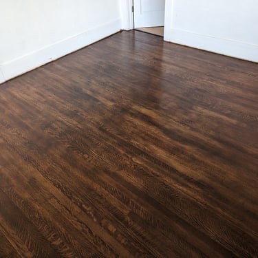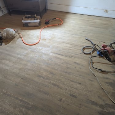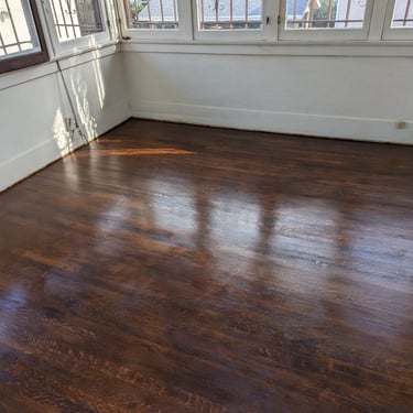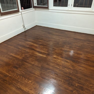 Final Coats: 2-3 final coats of the chosen finish are applied according to the manufacturer's instructions. In the images where the floor has a deep, rich brown color and a slight sheen, you can see how the coating beautifully accentuated the wood's structure and gave the floor a "rich," vintage look.